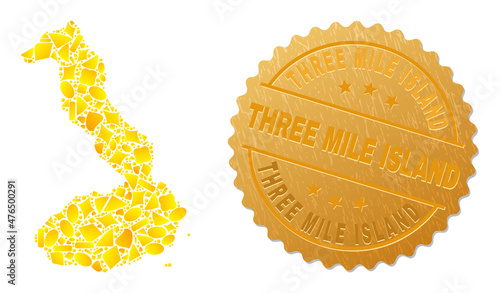 three, mile, island, map, gold, mosaic, stamp, seal, galapagos, geography, land, vector, illustration, concept, collage, yellow, gold, geographic, composition, composed, geographical, financial, wealth, treasury, filled, badge, caption, title, text, rosette, luxury, metal, metallic, fraction, pattern, fragment, scatter, emblem, message, phrase, texture, textured