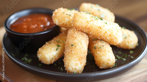 Golden mozzarella sticks coated with a crispy crust, paired with a sweet and sour sauce, perfect for dipping and enjoying every bite.