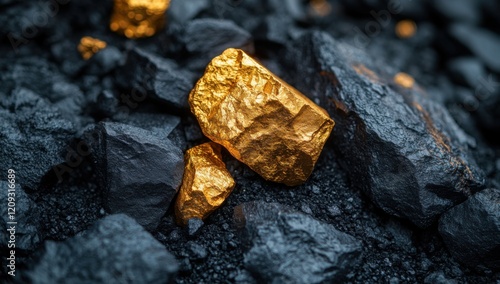 gold, nugget, rock, mineral, ore, mining, treasure, wealth, precious, metal, dark, black, stone, geology, earth, nature, texture, richness, luster, shiny, valuable, extraction, discovery, raw, unrefined, commodity, finance, investment, market, economy, industry, excavation, deposit, reserve, abundance, glistering, macro