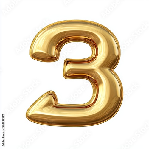 Golden Number Three 3D Render of a Shiny, Glossy Gold Number Three on White Background