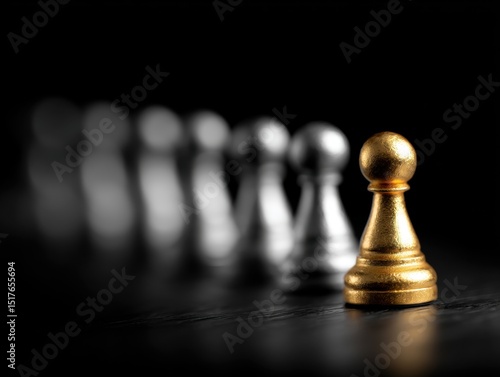 Golden pawn stands out among silver pawns in strategic display