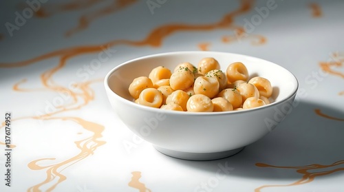 Golden Potato Gnocchi in White Bowl on Marble Surface