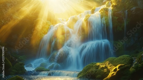 waterfall, nature, sunlight, water, rock, cascade, forest, landscape, scenic, photo, gold, ray, serene, peaceful, tranquil, calm, beautiful, amazing, breathtaking, marvellously, view, scene, image, picture, moss, green, yellow, blue, light, sunbeam, natural, environment, wild, fresh, flowing, power, energy, powerfull, heavenly, paradise
