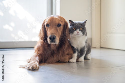 pet, animal, family, golden retriever, cute, cat, furry, nobody, lying down, companionship, friends, closeness, indoor, kitten, friendly, funny