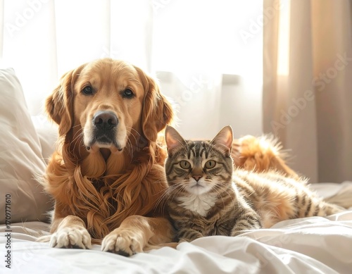 Golden Retriever and Tabby Cat Relaxing on a Bed
