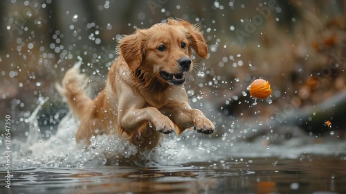 gold, retriever, run, jump, catch, ball, mid, air, water, splash, game, fast, beauty, canino, power, playtime, sport, happy, friendship, playful, quick, dog, breed, park