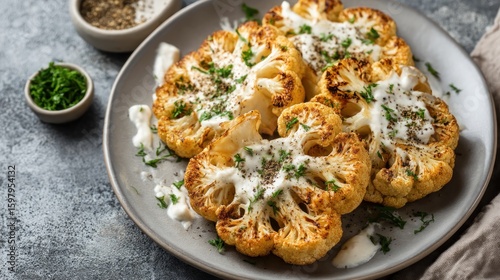 Golden roasted cauliflower steaks are drizzled with creamy sauce and fresh herbs, presented on a gray plate, showcasing a delicious and healthy vegetarian dish.