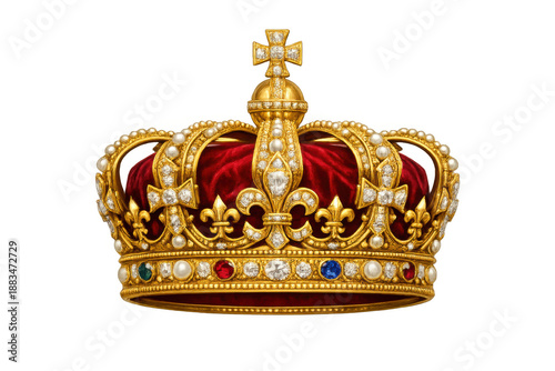 Golden royal crown with red velvet, jewels, pearls, and crosses showing power, monarchy, and luxury on transparent background