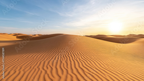 Golden sand dunes stretch under bright sky, evoking sense of freedom and tranquility