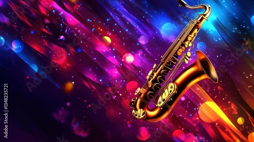 saxophone, instrument, artwork, illustration, digital, rendering, graphic, design, gold, brass, shiny, glow, radiant, vibrant, colourful, bokeh, light, streak, abstract, background, music, musical, jazz, entertainment, performance, festival, concert, night, show, stage, artistic, creative, celebration, party, graphic art, modern, decorative, element, poster, flier