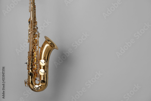 Golden saxophone on grey background. Space for text