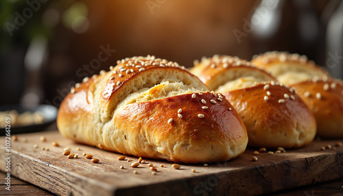Golden sesame challah bread on wooden board