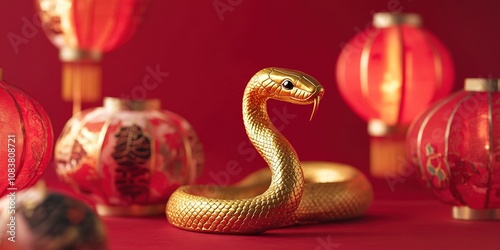 snake, gold, figurine, red, lantern, lunar new year, tradition, celebration, culture, asian, oriental, decoration, symbol, oriental zodiac, festive, ornament, background, red background, animal, metallic, gold, chinese new year, china, festival, holiday, 2025, new year, prosperity, luck, wealth, zodiac, traditional, light, cultural, festive season, copy space