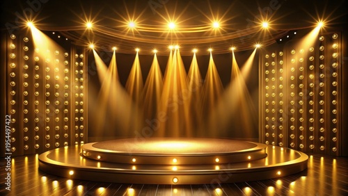 Golden stage illuminated with lights , elegance, majesty, elegance, majesty, performance, shining, spotlight
