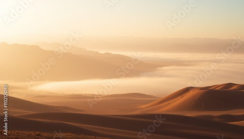 sunrise, desert, landscape, dune, sand, mountain, fog, mist, gold, light, morning, sun, sky, horizon, scenic, view, nature, beauty, serene, peaceful, tranquil, calm, warm, bright, yellow, orange, background, travel, adventure, exploration, wild, remote, huge, expansive, untouched, aerial, panorama, atmosphere, dreamy, hazy, aethereal, majestic, spectacular, stunning