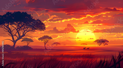 Golden Sunset over Savanna with Acacia Silhouettes