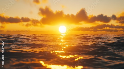 sunset, ocean, gold, horizon, wave, cloud, sky, sun, vibrant, warm, colours, light, water, surface, calm, nature, beautiful, dramatic, fiery, orange, yellow, seascape, atmosphere, glow, tranquil, peaceful, breathtaking, view, high-coloured, sunlight, serenity