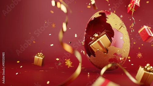 egg, gold, red, glistering, gift, box, present, confetti, falling, surprise, christmas, holiday, festive, celebration, decoration, happy, joy, magic, miracle, joyful, sparkle, shine, bright, elegant, luxury, ribbon, bow, pattern, textured, abstract, background, design, style, artistic, graphic