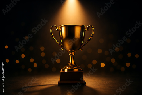 Golden trophy cup illuminated by spotlight with bokeh background for achievement