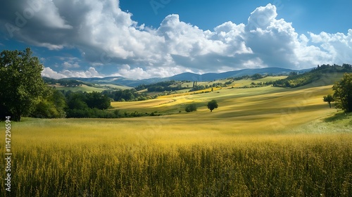 wheatfield, countryside, landscape, gold, hill, mountain, nature, summer, rural, farmland, cloud, sky, tree, scenic, beautiful, peaceful