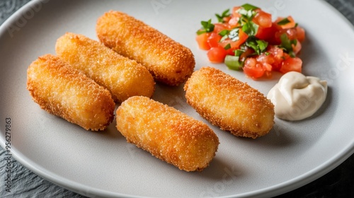 Golden-brown croquettes with tomato sauce and mayo create an irresistible, elegant appetizer.