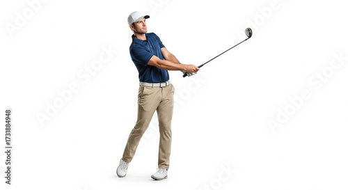 golfer, golf, golf club, isolated, white background, studio shot, athletic, sporty, male, man, young adult, full-length, action, dynamic, motion, concentration, sharpened, precision, skill, technique, power, swing, trousers, glove, sports equipment, leisure, hobby, recreation, outdoor sport, competition, professional, amateur, healthy lifestyle, active, fitness, advertising, commercial, cut-out, isolated object, determination, grace, form, elegance