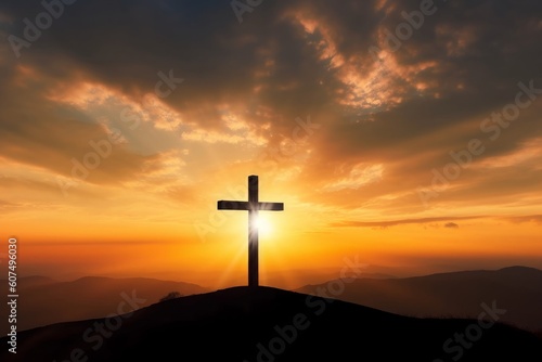 Good Friday concept: cross with sunset in the sky background, Generative AI
