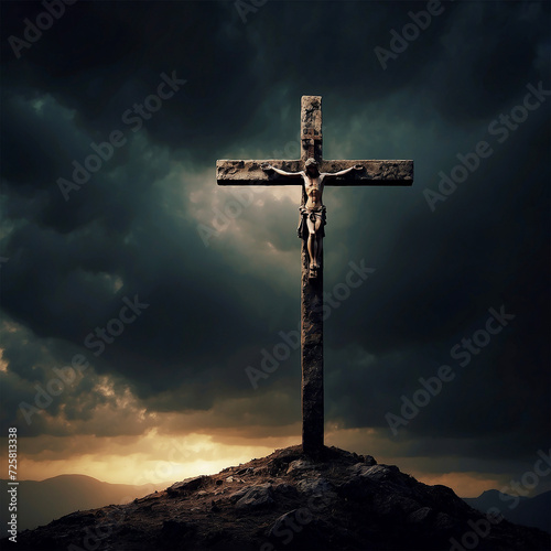Good Friday concept solemn Christian cross stands against a darkened sky