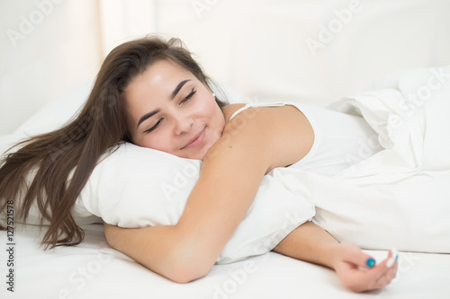lifestyle, bedchamber, attractive, arousing, good, room, relax, home, laziness, indoor, pillow, young, girl, morning, beautiful, beauty, relaxation, pretty, dream, up, awake, waking, sleep, woman, early, resting, adult, caucasian, bed, happy, joy, female, white, rest, person, lazy