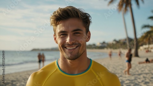 Good-looking young caucasian guy in yellow themed swimwear on a beach smiling