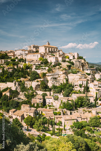Gordes, Provence, France. Beautiful Scenic View Of Medieval Hilltop Village Of Gordes. Sunny Summer Sky. Famous Landmark.