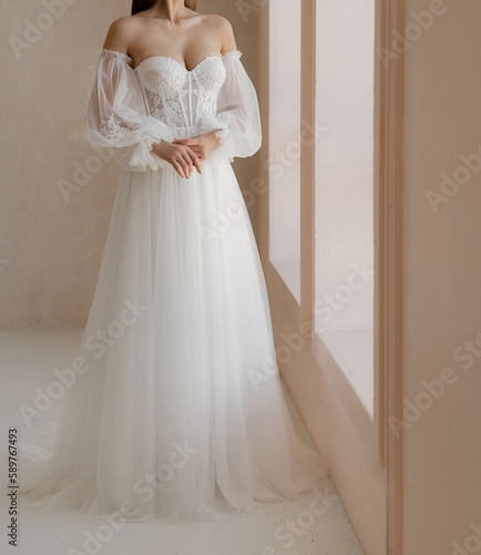 Gorgeous classic long wedding dress with cleavage and long sleeve decorated with floral lace. Bride in the shoulderless white wedding dress with deep neckline and long fancy wide see-through sleeves