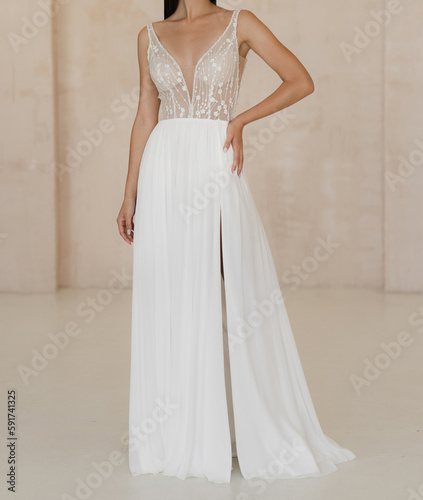 Gorgeous classic long wedding dress with cleavage decorated with floral lace. Bride in the sleevless white wedding dress with deep neckline