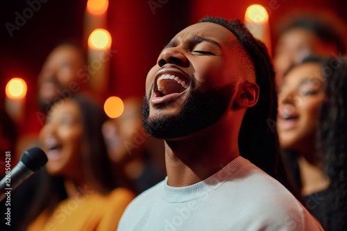gospel, choir, singing, church, music, worship, praise, faith, religion, christianity, community, performance, concert, spiritual, song, voice, harmony, microphone, singer, passion, emotion, inspiration, devotion, african american, tradition, celebration, hope, joy, belief, togetherness, oneness, ceremony, ritual, church service