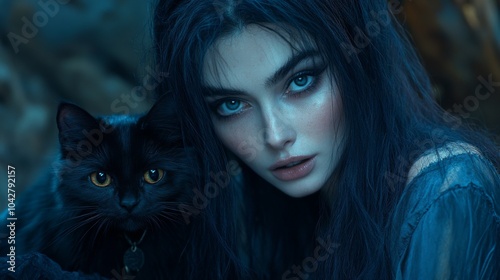 Gothic Witch with a mysterious black cat. Goth. Gothic. Feline. Halloween scene.