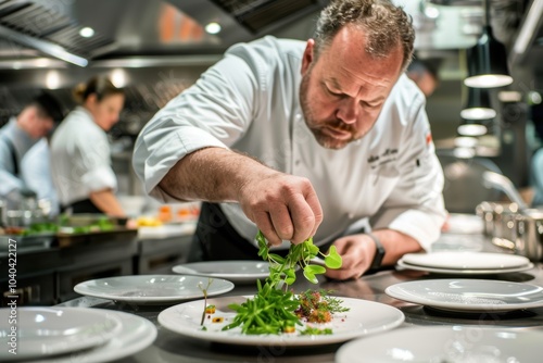 Gourmet Chef Perfecting a Dish in a Busy Michelin Starred Kitchen