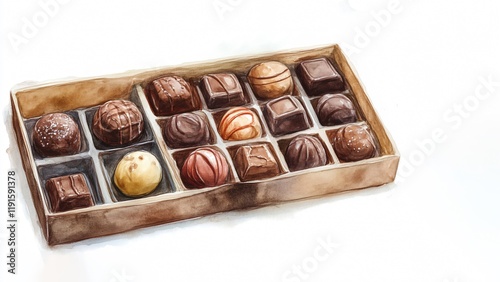 chocolate, epicure, selection, watercolor, assortment, praline, truffle, confectionery, gift box, luxury, dessert, hand-made, artisanal, variety, cocoa, dark chocolate, milk chocolate, white chocolate, food photography, delicious, sweet, indulgence, treat, bonbon, rich, creamy, appetising, brown, gold, temptation, special occasion, february 14, birthday, fine dining, culinary, premium, high-end, sophisticated, elegant, mouth-watering, decadent, gourmet food, confection, delicacy, celebration, anniversary