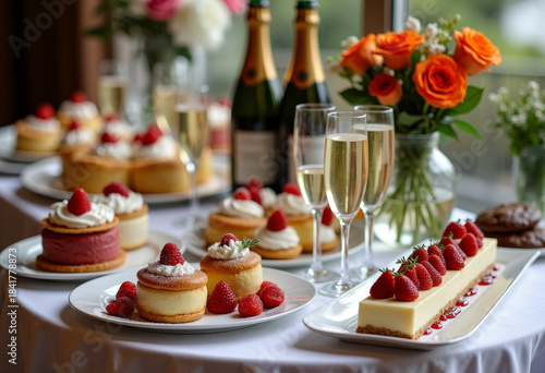 Gourmet dessert table with fine cakes and champagne, event catering atmosphere