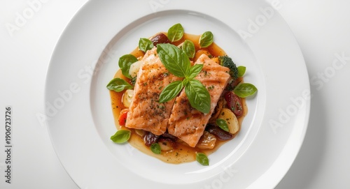 Gourmet healthy salmon and vegetable platter with basil leaves arranged on white plate from above
