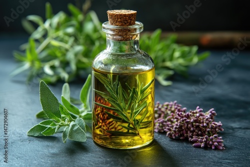 Gourmet oil: herbal aroma, Mediterranean tradition, golden extract, culinary accent, infused harmony, rich taste, exquisite essence, delicate seasoning, aromatic delight, premium ingredient.