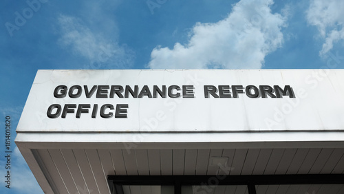 Governance Reform Office sign displayed on a building against a clear blue sky, symbolizing political change, official administration, restructuring, and policy development