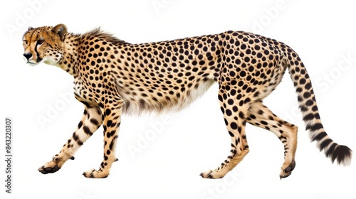 Graceful cheetah walking alone on white background, perfect for text or design elements