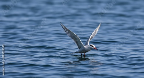 Graceful tern elegantly lands on calm blue water soft sunlight bathes its wings. AI Generated