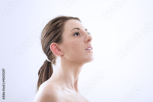 beauty, model, portrait, woman, attractive, bare, beautiful, brunette, caucasian, clean, complexion, confident, copy space, eye, face, female, feminine, femininity, fresh, graceful, head, health, healthy, lady, looking, naked, natural, neck, on white, person, poise, ponytail, pretty, profile, pure, raised, sexy, shoulder, sideway, skin, skincare, stretching, studio, up, well-being, young, youth, youthful