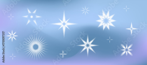 Gradient background with twinkle halftone stars shape. Dotted grain starburst collection on blue mesh in y2k pop style