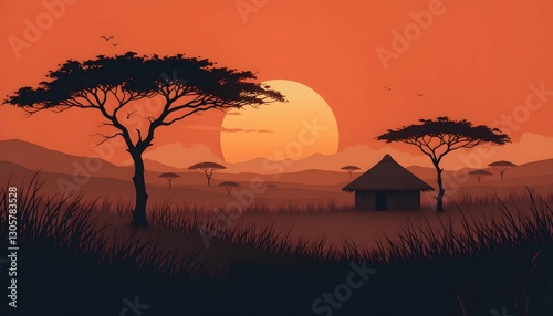 Gradient Orange-to-Red Background with African Hut and Savanna Patterns