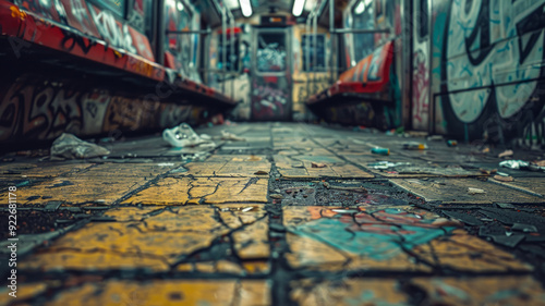 Graffiti-covered subway with cracked tiles and trash strewn around