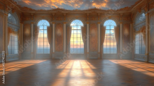 sun, sunset, sky, cloud, window, window, light, room, ballroom, grand, palace, luxury, interior, design, architecture, building, gold, elegant, ornate, classic, traditional, decor, decoration, pattern, floor, wood, parquet, wall, curtain, drape, castle, historical, historic, house, home, empty, space, wide, large, bright, beautiful, formal, event, gathering, reception, ceremony, wedding, party, royals