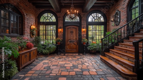 antechamber, entrance, staircase, brick, wood, door, window, plant, interior, design, luxury, home, house, architecture, elegant, grand, rustic, vintage, classic, traditional, cobbled, floor, lighting, chandelier, dark, brown, red, green, stone, autumn, cosy, warm, rich, inviting, roomy, hallway, residential, building, estate, luxury home