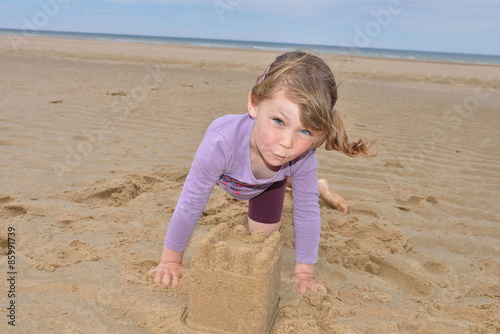 heat, castle, blond, caucasian, building, coast, outside, toddler, girl, summer getaway, vacation, beach, happy, childhood, game, game, sea, fun, dough, sand, bucket, sun, vitality, energy, summer, face, portrait, smile